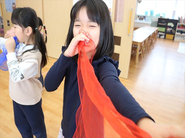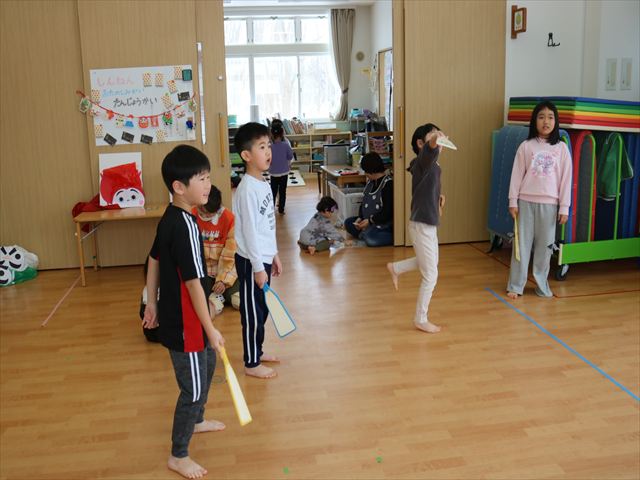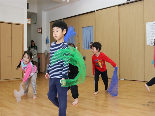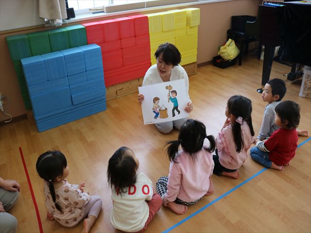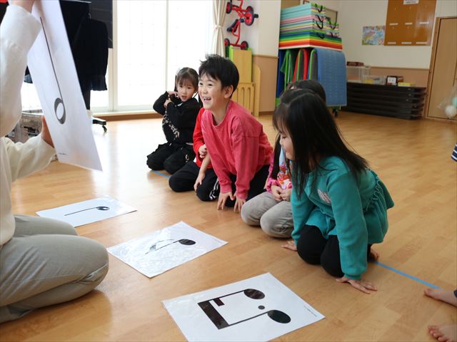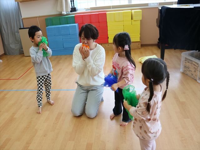 新年にふさわしく今日のテーマは「おもちつき」!ピアノに合わせて歩いたり止まったり、リズムスティックを使って音の速さや強弱、高い、低いを確認しました。久しぶりでしたがピアノの音を聴いているうちに身体で音を感じて皆、笑顔で取り組んでいましたよ。