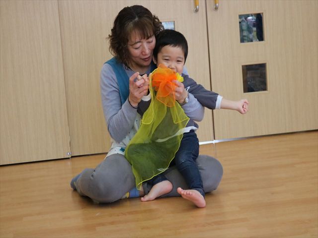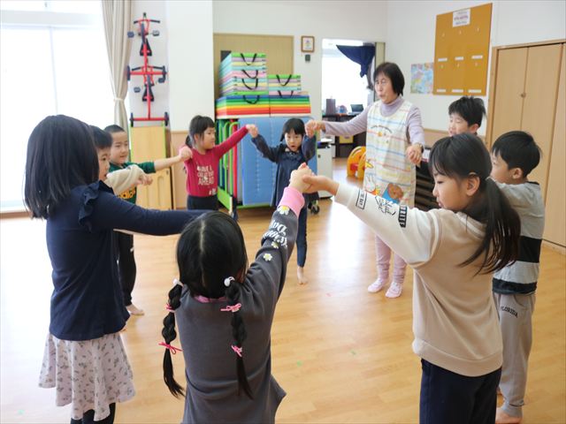 最後に皆で手をつないで輪になって四拍子、三拍子、幼児さんは八拍子のリズムを聞き分けて腕を振ったり、体を揺らしたり、前後に歩いたりしてリズムを身体で表現しました。