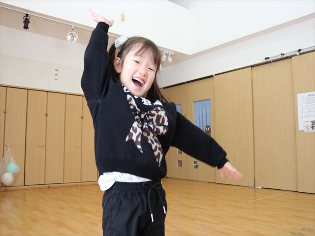 元気に朝の挨拶をした後、年長組全員が見本となって前に出て「めっちゃ元気体操」を皆でしました。