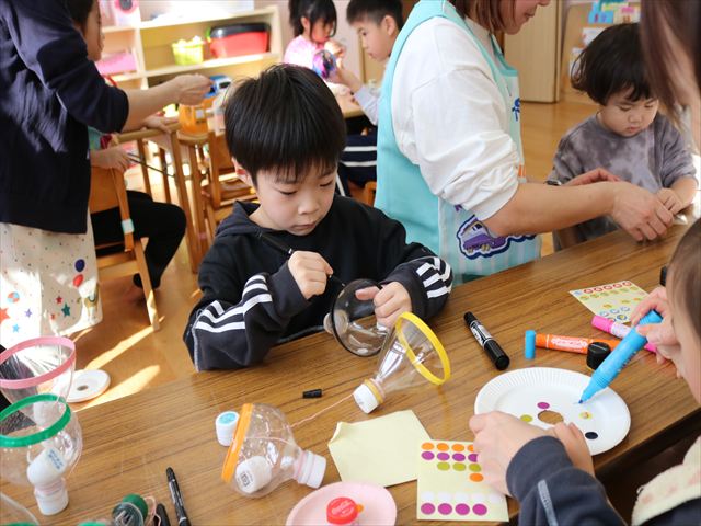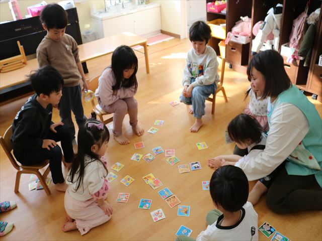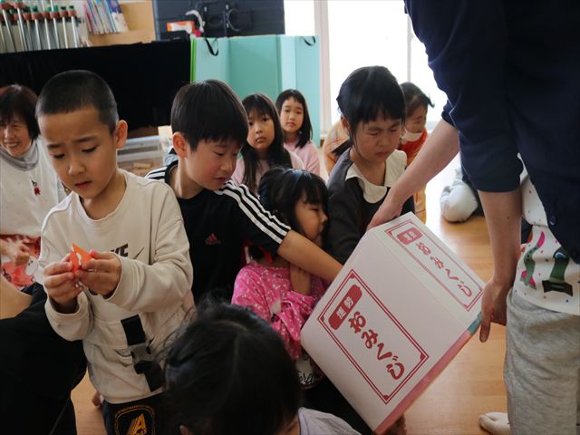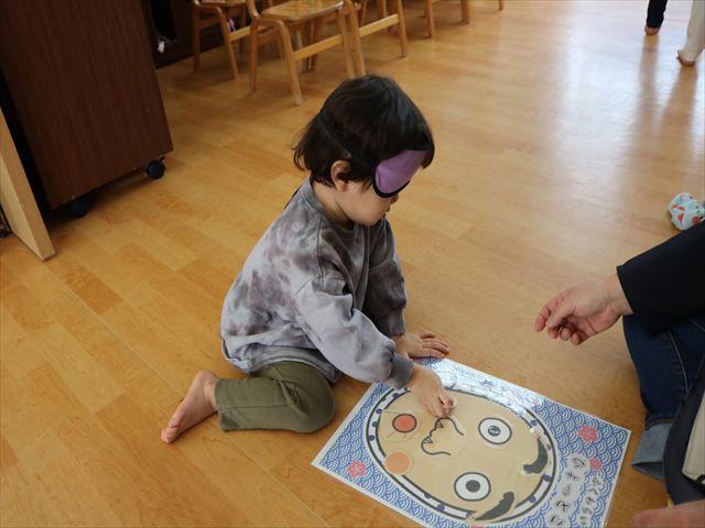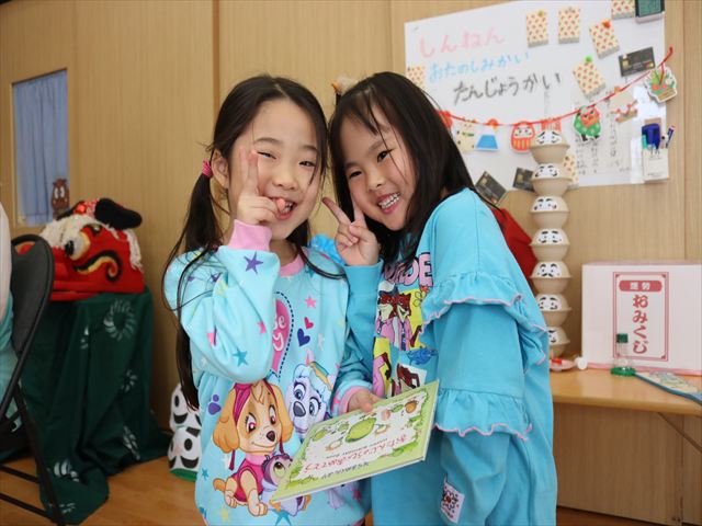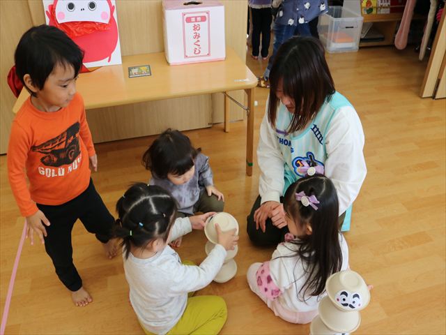 それからはコーナーに分かれてお正月あそびや製作を楽しみ、最後に保育園の非公式キャラクターくるみくんの缶バッジおみくじをひいて運試し。