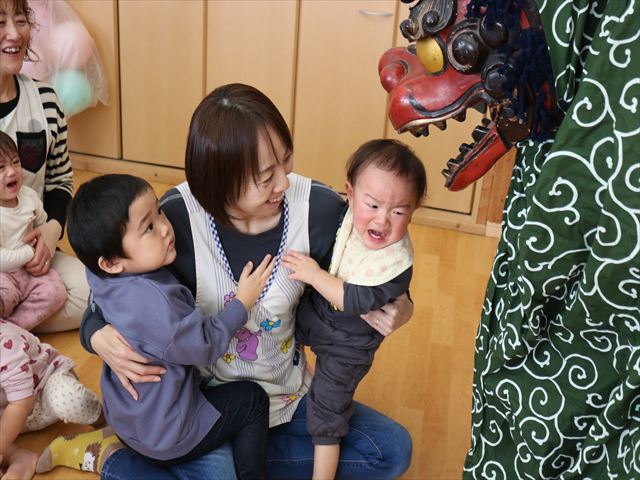 そのあとは毎年恒例のお獅子が登場しみんなの頭をカプカプ。乳児さんは大泣きしてしまう子もいましたがこちらも縁起物なので全員のところをまわってもらいました。