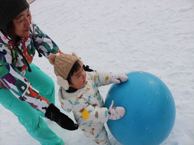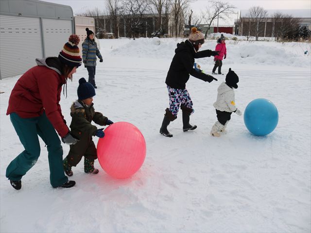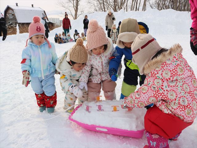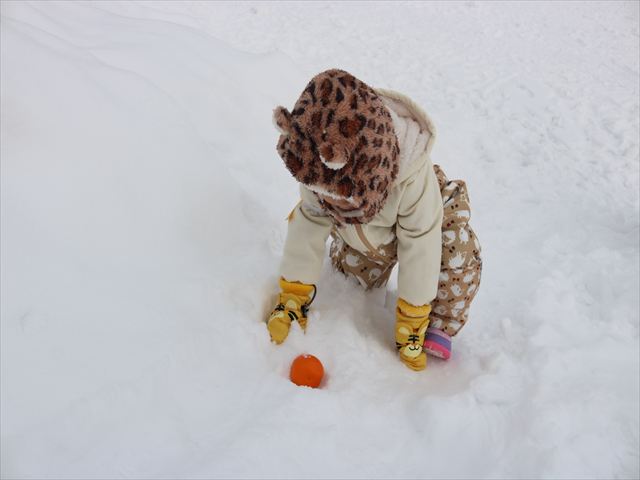 ①チーム対抗大玉転がし ②クラス対抗雪積み競争 ③ハイハイ競争&かけっこ ④みかん探し競争 ⑤チーム対抗フラック
