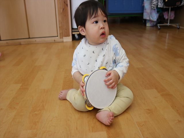 リトミックの中ではもう春です!みんなでタンバリンのハンドルを握ってお買い物に出かけました。
