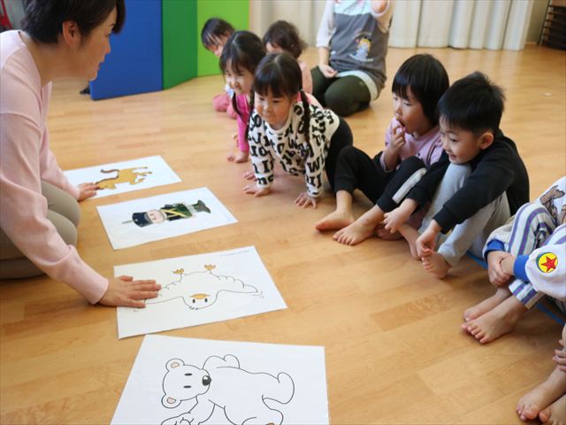 新入園児のお友だちは、これから何が始まるのかな?と辺りをキョロキョロ見ていましたが、綺麗なピアノの音が聞こえると音に合わせて先生と一緒にジャンプをしたり、カメさんやゾウさんのようなゆっくりした動きをしたり、低い音、高い音を聞いて小さくなったり先生に高い高いをしてもらって初めてでしたが大喜びで参加していました。