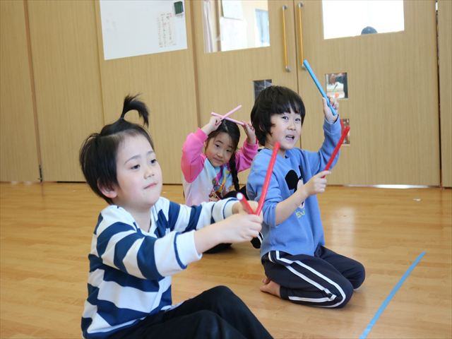 在園児たちは、音の上下の他にも強弱やピアノの音を聞いて止まったり、音符カードを見てリズム打ちができたり、どんどんレベルの高い動きができていましたよ。
