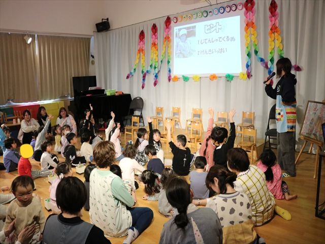先生からはスクリーンを使っての「ひなまつりルンルンおんなのこの日!」という絵本の読み聞かせもあり楽しい時間を過ごしました。