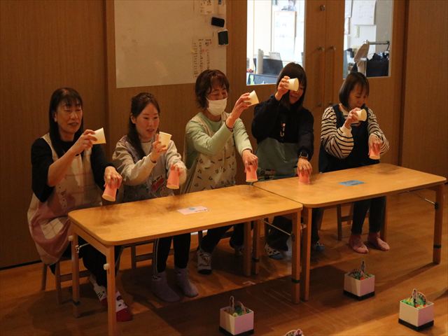 先生たちからの出し物では紙コップを使った技『カップス』の披露🎵