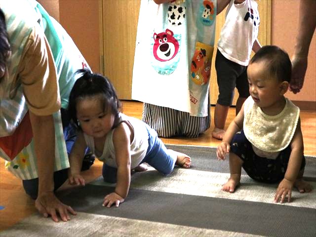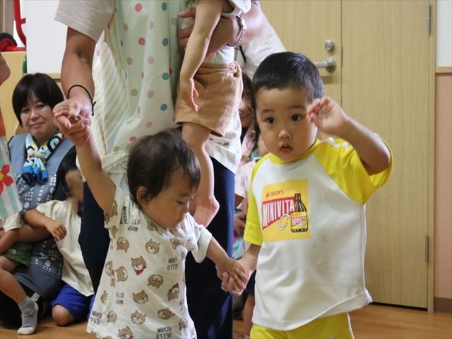 乳児クラスは馬車の馬に変身して動いたり、先生と一緒にダンスをしたり、兵隊さんに�なって行進したり、王様になって強そうに歩いたりしました。