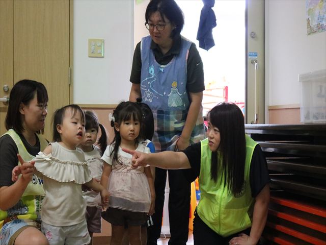非常ベルが鳴り主観保育教諭の「火事だよ~!」の声を聞くと、子どもたちは真剣な表情でホールに避難していました。