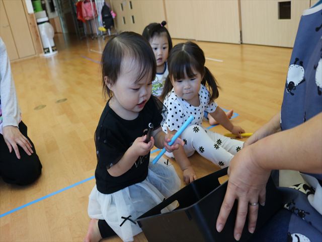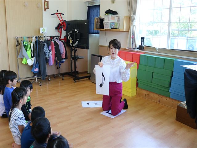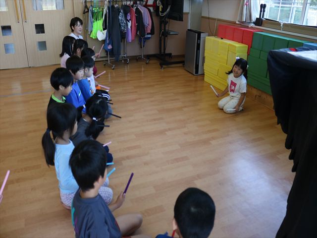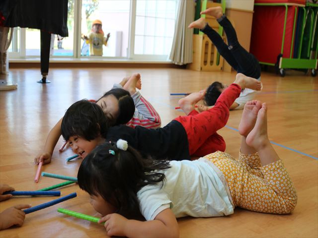 棒をもってピアノに合わせて床をたたいたり、歩いて止まったり子ども達は音を聞いて動くことにも慣れた様子。