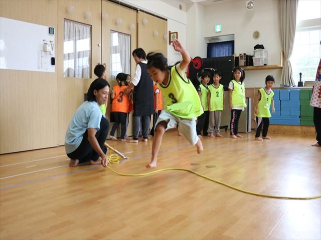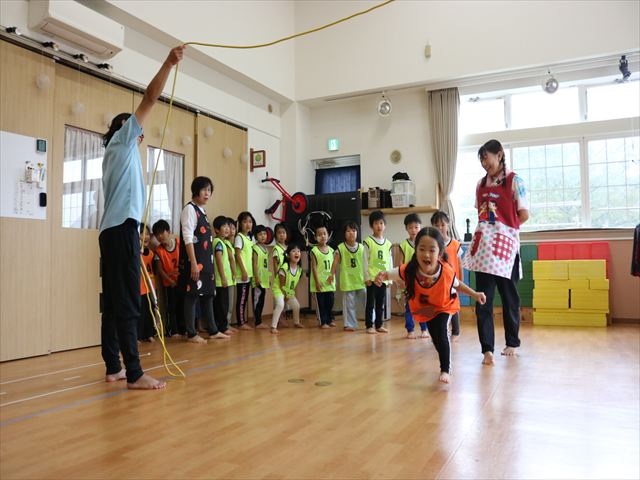 今回は大縄跳びを使って、くぐったり、跳び越えたり、跳んだり!