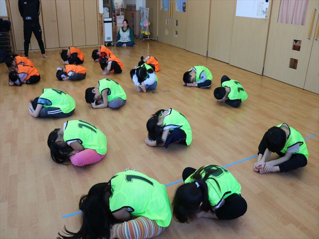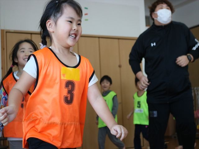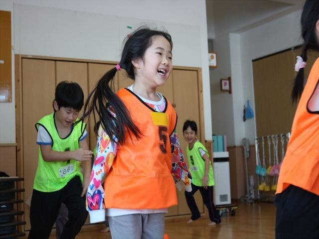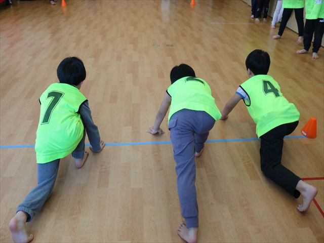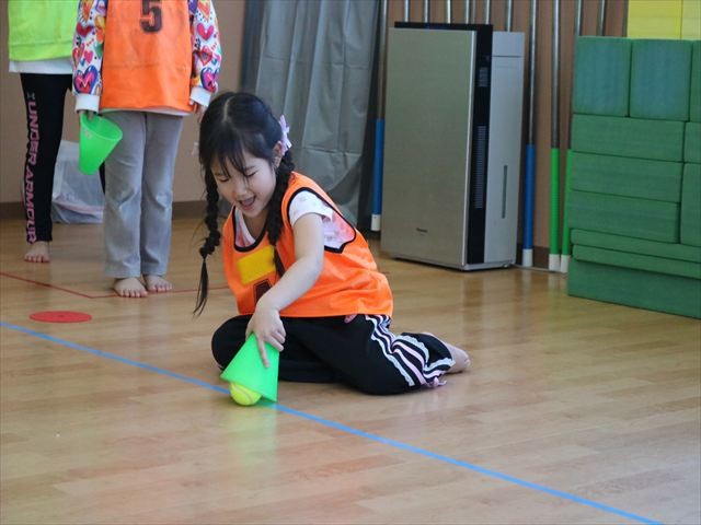 次に鬼になったお友だちに捕まらないように、向こう側にマーカーを置きに行くというゲームを行い、